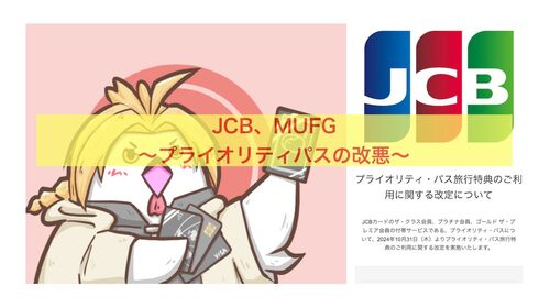 Xでは阿鼻叫喚。 私「あーらま」 JCBが MUFGが 私「プライオリティパスの改悪ですか。はいはい」 改悪するそうですね。10月から。 (JCBのお知らせ) (MUFCのお知らせ) これを見た私の感想としては・・・ 私「いやさー、使えたら良いものなんだけどさぁ…